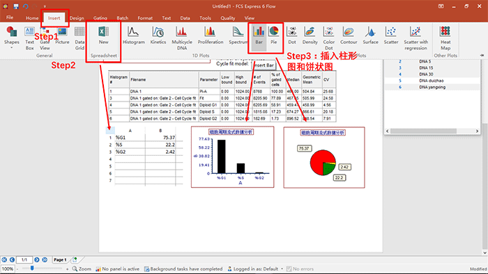 a.舉例,對細胞周期中G1期,S期及G2期各細胞比列的情況分析并做成柱形圖及餅狀圖,直接插入Spreadsheets,然后將相應的數(shù)據(jù)拖拽入表格中,點擊insert命令按鈕,插入相應的柱形圖和餅狀圖,操作如下: