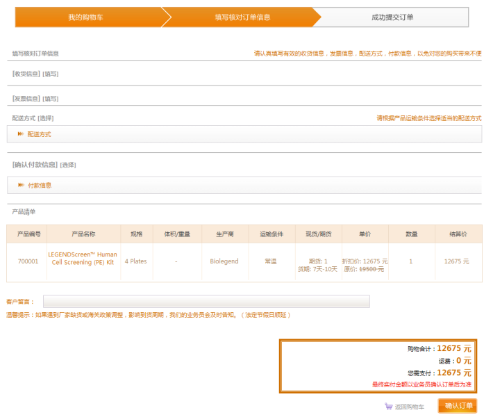 點(diǎn)擊購(gòu)物車(chē)頁(yè)面的“結(jié)算”進(jìn)入填寫(xiě)訂單信息的頁(yè)面,在此頁(yè)面請(qǐng)認(rèn)真填寫(xiě),收貨地址、發(fā)票信息、配送方式、支付方式等信息。點(diǎn)擊“確認(rèn)訂單”即可生成訂單。