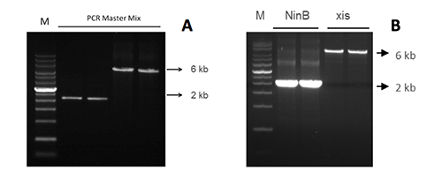 B 使用PCR Dye Mix II擴增NinB基因(2 kb)和xis基因(6 kb)