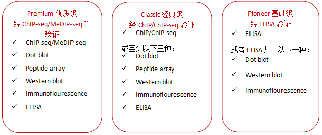 自2004年以來,Diagenode就與領(lǐng)先的表觀遺傳學專家和表觀遺傳學聯(lián)盟合作生產(chǎn)、驗證包括抗體在內(nèi)的表觀遺傳學試劑。2012年,Diagenode用一種創(chuàng)新、嚴謹?shù)目贵w分類系統(tǒng)改革了免疫沉淀技術(shù),用于表觀遺傳學研究。根據(jù)驗證水平將抗體分為三個不同級別,以幫助您建立選擇抗體的信心。最終,用您信任的抗體獲得滿意的結(jié)果。