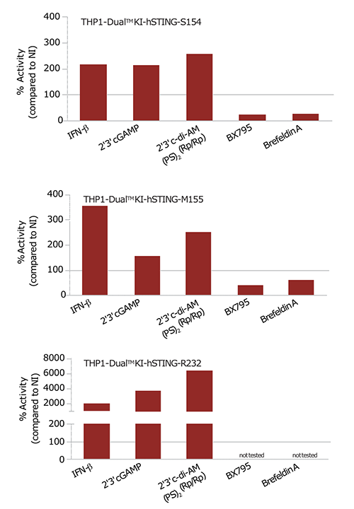 功能獲得(Gain-of-function)的活化-THP1-Dual? KI-hSTING-S154細(xì)胞和THP1-Dual? KI-hSTING-M155細(xì)胞均均可以持續(xù)活化ISG,而THP-1-Dual? KI-hSTING-R232卻不能。加入IFN-β或STING激動(dòng)劑將進(jìn)一步促進(jìn)ISG的活化。注意,結(jié)果已被非刺激細(xì)胞背景信號(hào)標(biāo)準(zhǔn)化。因?yàn)槠涑掷m(xù)活化STING的特性,SAVI細(xì)胞的背景非常高,誘導(dǎo)ISG應(yīng)答的增加倍數(shù)低于R232對(duì)照細(xì)胞。