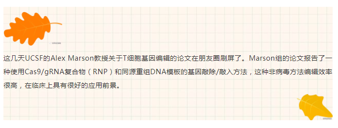 文章的共同通訊作者為密西根大學的徐捷教授和康奈爾大學的夏曉峰教授。這篇文章和Marson組文章的共同點是都使用電轉(zhuǎn)Cas9RNP的方法在一些之前認為很難編輯的細胞上取得了很高的同源重組效率。Marson實驗室的研究更加深入,在免疫治療上幾個重要的基因位點做了基因編輯的研究,不僅對于CAR-T可能有很大幫助,對于TCR-T的制備可能也有重要意義。