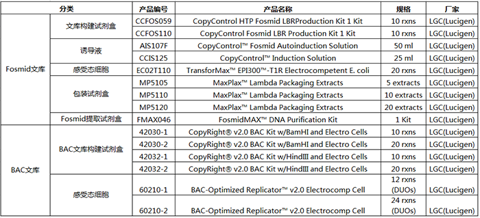 LGC(Lucigen)提供Fosmid文庫構建試劑盒,該試劑盒中的Fosmid載體是行業(yè)金標準(原屬于Epicentre產(chǎn)品),可完成各種生物樣本編制完整和無偏向的Fosmid文庫,利用自動誘導液保證單拷貝和誘導高拷貝數(shù)量的需要。