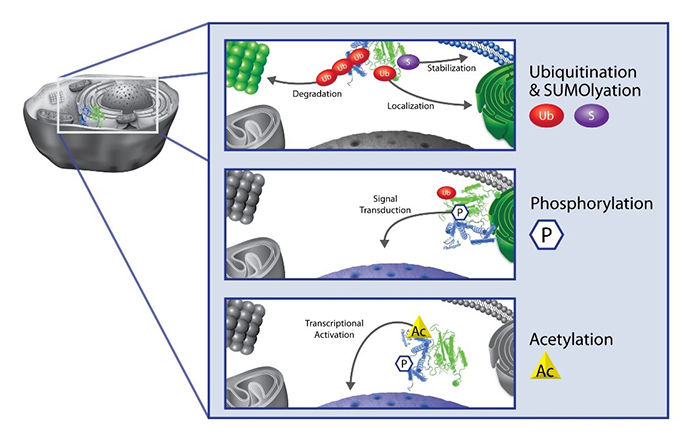 盡管目前已知的PTM的種類超過400種,但只有少數(shù)幾個(gè)被詳細(xì)研究過,主要包括甲基化、磷酸化、乙?;⒎核鼗?/span>SUMO化,它們被證明是幾乎所有細(xì)胞的關(guān)鍵調(diào)節(jié)因素,包括信號(hào)轉(zhuǎn)導(dǎo)、表觀遺傳學(xué)、基因和蛋白質(zhì)表達(dá)、蛋白質(zhì)穩(wěn)定性和定位以及細(xì)胞免疫。