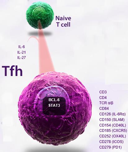 主要標記物:Tfh 細胞屬于 CD4+ T 細胞亞群,其表型特征為 CXCR5+CD40LhiICOShi ,并且還表達細胞因子 IL-21 和轉(zhuǎn)錄因子 Bcl-6 。 IL-21 和 Bcl-6 ( B-cell lymphoma 6 )對于 Tfh 細胞的發(fā)生和發(fā)育至關(guān)重要。其中 IL-21 誘導 Tfh 的分化并促進其表面 CXCR5 的表達; Bcl-6 對于 Tfh 轉(zhuǎn)移到淋巴濾泡和 B 細胞發(fā)生中心( Germinal center )的形成必不可少。
