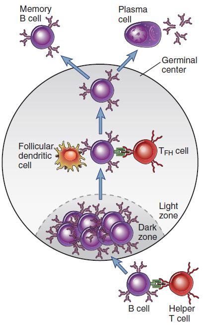 Tfh 細胞的主要作用是增加高親和力 B 細胞和長壽漿細胞的形成,并幫助他們轉(zhuǎn)移到發(fā)生中心(GC)。在接受抗原刺激后,初始 B 細胞首次移動到 T 細胞區(qū),且在來自 Tfh 細胞和抗原呈遞細胞的共刺激作用下開始活化并形成發(fā)生中心。當發(fā)生中心的 B 細胞開始分化為漿細胞或記憶 B 細胞時, Bcl-6 會阻止 B 細胞的增殖,因為 Bcl-6 可以抑制 B 細胞活化基因的表達,如 CD69、 STAT1 和 CD80 等,同時也會通過調(diào)節(jié) Prdm1 來抑制發(fā)生中心的 B 細胞向漿細胞分化。 Tfh 細胞通過 CD40 的作用致使 Bcl-6 轉(zhuǎn)錄沉默,從而促使發(fā)生中心 B 細胞存活和增殖。且在這一過程中,CD40L、PD-1、BAFF、IL-4 和 IL-21 等信號分子的參與也是必不可缺的。