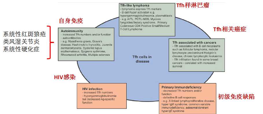 因此,基于 Tfh 細胞的功能特性,其與多種疾病密切相關(guān)。 Tfh 細胞及相關(guān)分子的缺陷會導致正常的 B 細胞反應不能完成,產(chǎn)生體液免疫缺陷。相反, Tfh 功能亢進也會導致病態(tài)的自身免疫反應,介導自身免疫病的發(fā)生。目前對 Tfh 的研究也主要集中在其與自身免疫疾病和 HIV 的關(guān)系上面。