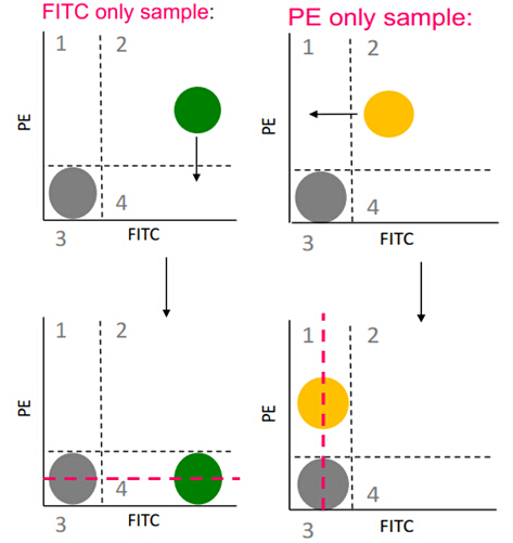 (3)PE單染管:同理,將進(jìn)入FITC探測(cè)器的PE信號(hào)通過(guò)補(bǔ)償調(diào)節(jié)來(lái)消除。