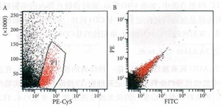 PE-Cy5通道(通常是FL3,接收的熒光波長范圍大致為655-685nm)有時可用于識別死細(xì)胞,但首先該通道必須是閑置的通道,及樣本細(xì)胞中沒有標(biāo)記該通道代表的熒光素(PE-Cy5、PerCP等)偶聯(lián)抗體。選擇PE-Cy5-SSC散點圖,一般可看到不成群的PE-Cy5陽性細(xì)胞,這些陽性細(xì)胞的SSC值也是散在分布的,這些散在的PE-Cy5通道非標(biāo)記陽性細(xì)胞,即圖2-A中的紅色部分,將這部分細(xì)胞設(shè)門顯示于FITC-PE散點圖中,如圖2-B所示,這部分PE-Cy5通道非標(biāo)記陽性細(xì)胞基本都位于對角線部分,而對角線細(xì)胞一般為死細(xì)胞,所以散在的PE-Cy5通道非標(biāo)記陽性細(xì)胞一般就是死細(xì)胞。