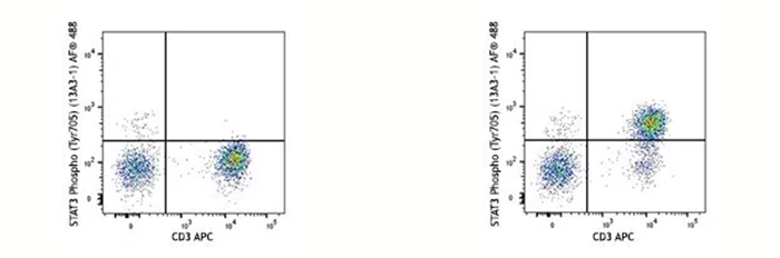 在蛋白翻譯后修飾(磷酸化、乙?;⒓谆龋┑难芯窟^程中,固定劑不僅可以有效的“固定”住翻譯后修飾的位點(絲氨酸、蘇氨酸、酪氨酸等),也可以防止目標位點在活細胞中很快降解(比如磷酸酶會去除磷酸化修飾、去甲基化酶會移除甲基化修飾等)。下面的例子是用IL-6的重組蛋白刺激人外周血15分鐘后看STAT3第705位酪氨酸的磷酸化水平,在刺激完樣本后就需要通過固定來實現目的氨基酸磷酸化水平“停留”在IL-6刺激15分鐘這個節(jié)點上。
