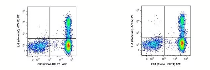 左圖:human PBMC刺激完當天染色后上機檢測;右圖:同一樣本,表染和固定后,保存在Cyto-Last? buffer里面,14天后做胞內染色并上機。