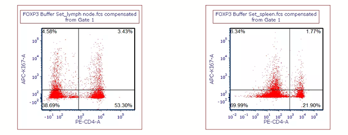 用BioLegend FOXP3 Buffer set對細胞進行固定破膜處理后,染Ki-67抗體,左圖:小鼠淋巴結樣本;右圖:小鼠脾臟樣本。