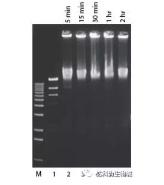 pUC 19 DNA用Pvu II消化,然后按標(biāo)準(zhǔn)連接反應(yīng)使用2U Fast-Link? ligase進行連接(泳道1-6). 泳道 M,1-kb ladder;泳道1,無酶對照;泳道2-6, 分別為5 min, 15 min, 30 min, 45min, 1 hr連接結(jié)果。