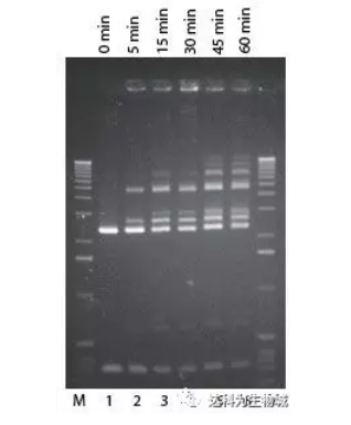 按標(biāo)準(zhǔn)連接反應(yīng)使用2U Fast-Link? ligase進行Lambda Hind III markers連接(泳道2-6). 泳道M, 1-kb ladder;泳道1,無酶對照;泳道2-6, 分別為5 min, 15 min, 30 min, 1 hr, 2 hr連接結(jié)果。