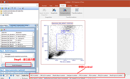 依次調(diào)整好各單管Control的Marker門的位置。此處不一一列舉?;氐窖a(bǔ)償界面。此處的3、4適用于使用補(bǔ)償beads調(diào)節(jié)補(bǔ)償?shù)那闆r(由于本次數(shù)據(jù)為細(xì)胞,此處不詳細(xì)列出,如對此步驟感興趣,可咨詢小達(dá)君)