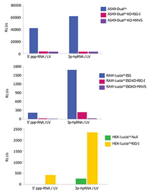 ISG對(duì)RIG-I配體的反應(yīng):使用300 ng/ml的5’ppp-dsRNA或30 ng/ml的3p-hpRNA刺激衍生自A549的細(xì)胞;使用1 μg/ml 5’ppp-dsRNA或3p-hpRNA刺激衍生自RAW和HEK293的細(xì)胞。經(jīng)過孵育過夜,可使用QUANTI-Luc?檢測(cè)上清中Lucia熒光素酶活性的相對(duì)光單位(RLUs)以測(cè)試ISG的反應(yīng)。