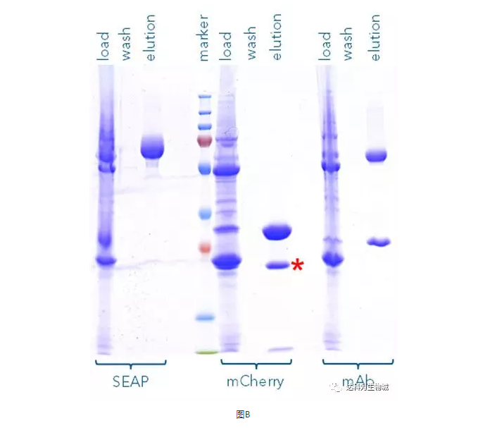 此外,我們也測(cè)試了其他的蛋白,例如SEAP(72 kDa)或抗體(mAb,其重鏈為55kDa)。圖B為以Strep-Tactin?XT純化SEAP-TST、mCherry-TST與mAb-TST的SDS-PAGE分析結(jié)果,可見(jiàn)對(duì)于不同蛋白,Strep-tag?系統(tǒng)都能純化出高純度的目標(biāo)蛋白。(注:紅色標(biāo)記處為 mCherry的降解產(chǎn)物,非雜帶)