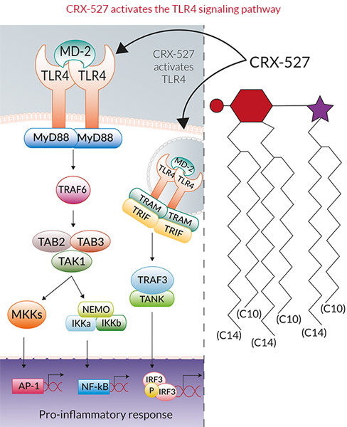 CRX-527屬于AGP(aminoakylglucoaminide 4-phosphate)家族,是一種合成的脂質A類似物,可以激活Toll樣受體4(TLR4),進而啟動MyD88和TRIF依賴的促炎信號級聯反應。重要的是,CRX-527無需TLR4輔助受體CD14即可激活TRIF介導的Ⅰ型干擾素信號通路。 CRX-527與其他AGPs一樣,毒性低于LPS,并且重要的是保留了它的免疫刺激特性。作為未來的疫苗佐劑和單獨的免疫刺激劑,AGPs具有巨大潛力。