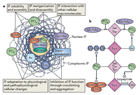 下圖以中間絲蛋白(IF)為例,描述了針對(duì)于IF的各種不同PTM對(duì)于其蛋白功能的影響: