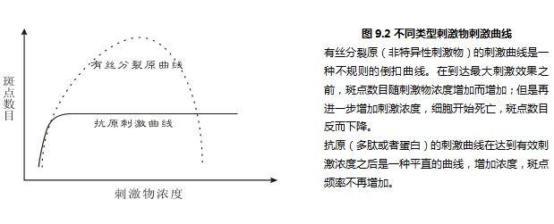 其一、非特異性的刺激物刺激效果不穩(wěn)定。如圖9.2所示,非特異性的刺激物(有絲分裂原Mitogen)的刺激曲線幾乎沒有平坦的部分。也就是說,刺激物的濃度有細(xì)微變化,馬上就會(huì)體現(xiàn)在刺激斑點(diǎn)數(shù)目的變化上了,這樣實(shí)驗(yàn)結(jié)果很難完全重現(xiàn)。相反,抗原的刺激曲線非常平坦,只要達(dá)到有效刺激濃度,斑點(diǎn)頻率就不再變化。