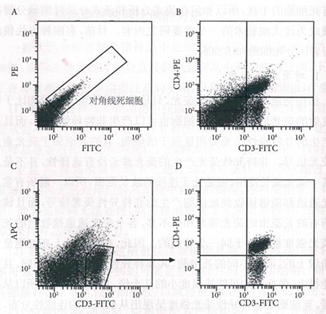 雖然死細(xì)胞位于散點圖的對角線上,但是對角線上的細(xì)胞確不一定是死細(xì)胞,因為雙陽性細(xì)胞如果在x軸和y軸的熒光信號相似時,也可以位于對角線上。所以,散點圖對角線上的細(xì)胞可能是死細(xì)胞,也可能是雙陽性細(xì)胞。如圖1-B所示,樣本細(xì)胞為正常小鼠脾臟細(xì)胞,標(biāo)記 FITC-抗CD3抗體和PE-抗CD4抗體,F(xiàn)ITC和PE雙陽性的CD4 T細(xì)胞和死細(xì)胞混在一起,無法區(qū)分。但是死細(xì)胞和雙陽性細(xì)胞的形狀是不一樣的,死細(xì)胞呈現(xiàn)連續(xù)的線型分布,而雙陽性細(xì)胞群呈現(xiàn)圓形的群體分布,因此,可以從對角線上的細(xì)胞群體的形狀大致判斷細(xì)胞的性質(zhì)。雖然不能根據(jù)熒光強(qiáng)度的強(qiáng)弱來區(qū)分該熒光信號是來自于死細(xì)胞的非特異性熒光還是來自熒光素產(chǎn)生的熒光,但是可以利用在散點圖上死細(xì)胞位于對角線的特點來區(qū)分死細(xì)胞和陽性活細(xì)胞。如圖1-C所示,x軸表示FITC通道(樣本細(xì)胞標(biāo)記有FITC-抗CD3抗體),y軸表示APC通道(閑置通道),借用該散點圖可以明確區(qū)分圖1-B中無法區(qū)分的死細(xì)胞和雙陽性細(xì)胞。此時只需要將排除了死細(xì)胞后的CD3 T細(xì)胞設(shè)門,將門內(nèi)的細(xì)胞顯示于新的FITC-PE散點圖中,如圖1-D,此時該散點圖內(nèi)的細(xì)胞都是活細(xì)胞,因為樣本細(xì)胞同時標(biāo)記有PE-抗CD4抗體,所以圖中的細(xì)胞明顯分為兩群,雙陽性的是CD4T細(xì)胞,單陽性的是CD8 T細(xì)胞。