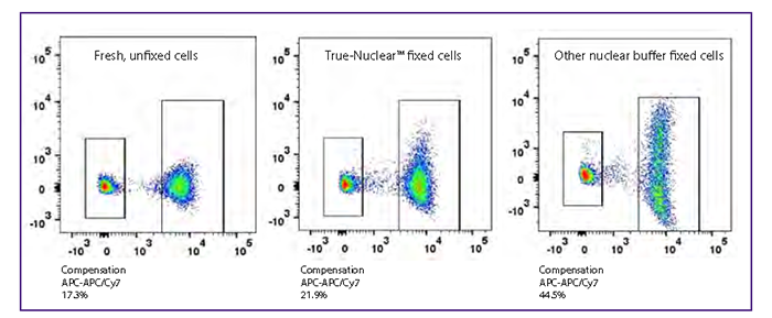 主要表現在固定劑對串聯染料(tandem-dye,如APC/Cy7、PE/Cy7等)的影響:一個是固定劑有可能造成串聯染料的斷裂,比如APC-Cy7和4%多聚甲醛溶液接觸時間超過4個小時染料就有可能斷裂,所以如果細胞直接重懸在固定液里面建議盡快上機,如果要放到第二天上機,需離心去除固定液后重懸在流式染色液或者是PBS里面,當然有一些新的串聯熒光素可以有效減少這種情況,比如BioLegend的APC/Fire750TM染料。