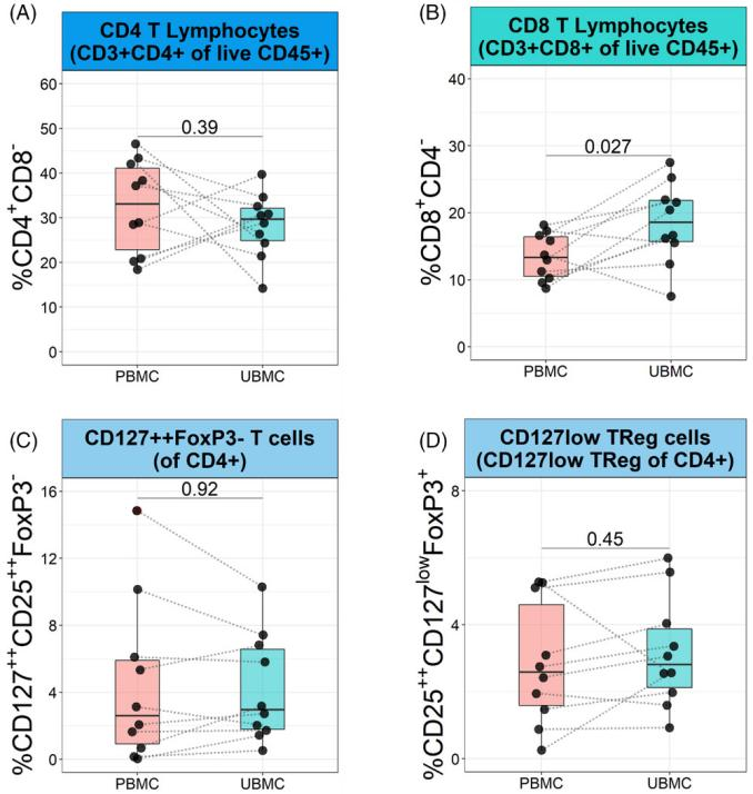 圖7 PBMC和UBMC白細(xì)胞群中T細(xì)胞群的檢測。
