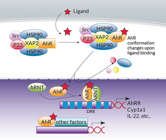 芳香烴受體(AhR)是一種配體依賴性轉(zhuǎn)錄因子,在屏障組織中的免疫,上皮,內(nèi)皮和基質(zhì)細胞中廣泛表達1。過去的研究集中關(guān)注AhR跟二噁英等化學(xué)污染物的關(guān)系,但最新研究表明AhR是參與更廣泛環(huán)境變化應(yīng)答的中心傳感器,以確保宿主和腸道微生物群之間的腸內(nèi)穩(wěn)態(tài)1。