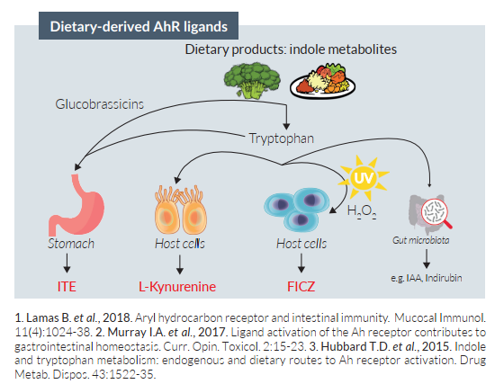 除了像2,3,7,8-四氯雙苯環(huán)二噁英(TCDD)的環(huán)境中的異質(zhì)物,多種膳食來源的AhR配體也已經(jīng)被鑒定出,而其中許多是色氨酸(Trp)氨基酸代謝的副產(chǎn)物4?,F(xiàn)在AhR已被認知為宿主微生物群落共生的調(diào)節(jié)因子。一方面,膳食配體激活的AhR幫助塑造腸道細菌組成5,另一方面,AhR傳感能夠調(diào)節(jié)腸道免疫細胞的穩(wěn)態(tài)和功能6。