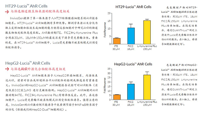 InvivoGen提供兩個AhR報告細胞系,分別改造自人HT29結(jié)腸腺癌和HepG2肝癌細胞系。HT29-Lucia?AhR細胞和HepG2-Lucia? AhR細胞有助于研究AhR激活作用,可以幫助了解多種激動劑如外源物質(zhì)和飲食衍生的吲哚產(chǎn)物對AhR的激活反應(yīng)。最重要的是,我們的AhR報告細胞是人源細胞,并且內(nèi)源性表達人AhR,這使得它們與人類樣本中篩選內(nèi)源性AhR激動劑高度相關(guān)。