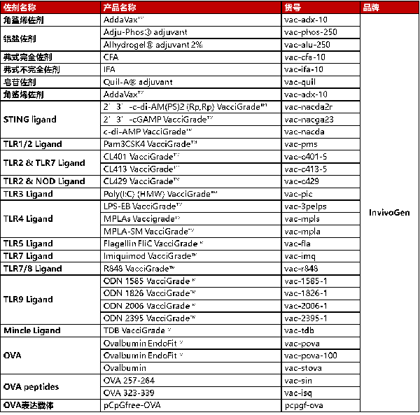 當(dāng)前,針對COVID-19的疫苗研發(fā)以前所未有的速度在世界范圍內(nèi)陸續(xù)開展,世界各地的科學(xué)家正在探索開發(fā)針對SARS-CoV-2的有效疫苗的所有潛在策略。大多數(shù)用于COVID-19的候選疫苗旨在誘導(dǎo)針對病毒S蛋白的中和抗體,防止病毒通過人ACE2受體攝取從而阻止感染。COVID-19疫苗開發(fā)前景的顯著特征是正在評估的技術(shù)平臺的多樣性,包括:減毒活疫苗,基于病毒載體的疫苗,基于重組蛋白的疫苗,DNA疫苗和RNA疫苗。其中重組蛋白疫苗通常使用SARS-CoV-2蛋白(例如S蛋白)在宿主中引起免疫反應(yīng)。通常與佐劑結(jié)合使用以提高免疫原性。迄今為止,已進(jìn)入臨床試驗的COVID-19候選疫苗包括Moderna開發(fā)的mRNA疫苗(NCT04283461)和康希諾 (NCT04341389)開發(fā)的重組腺病毒疫苗。此外,諸如AS03和MF59等佐劑正在重組蛋白疫苗中進(jìn)行探索,使用佐劑可增強免疫原性并降低劑量,使更多人接種疫苗成為可能。天然免疫專家InvivoGen提供科研用途的佐劑和OVA產(chǎn)品供研究人員選擇。